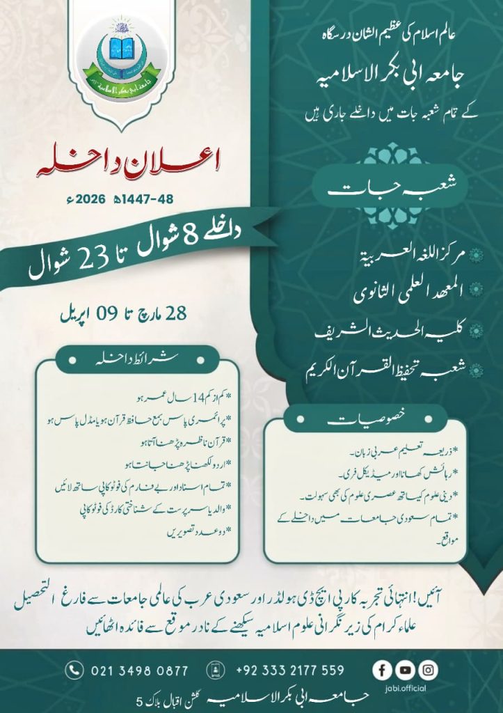 Admissions are now open at Jamia Abi Bakr Al-Islamia for the academic session 1447–48 / 2026.